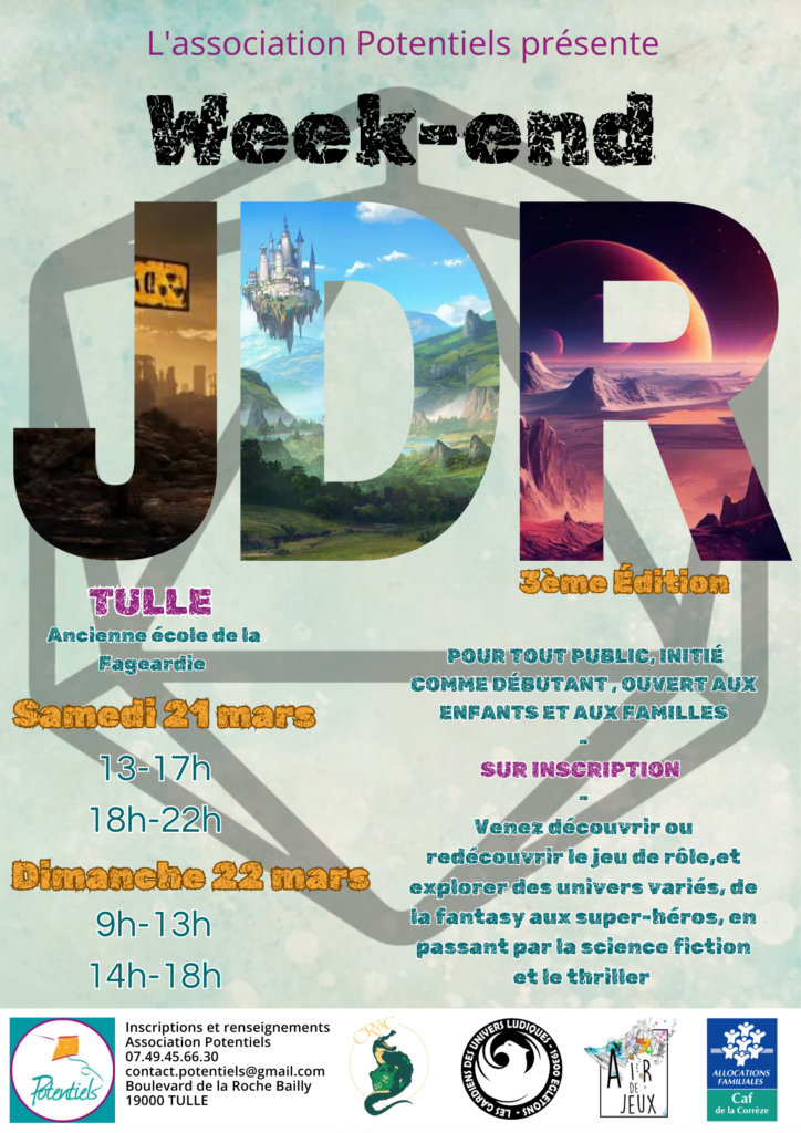 L’Association Potentiels vous invite à un week-end « jeux de rôle »(à partir de 8 ans), organisé par Gabin, bénévole, aidé d’Axel, notre jeune volontaire en service civique, avec la participation de plusieurs jeunes du SAS et des Mercredis Atypiques, ainsi que de plusieurs bénévoles de l’association et d’ailleurs.